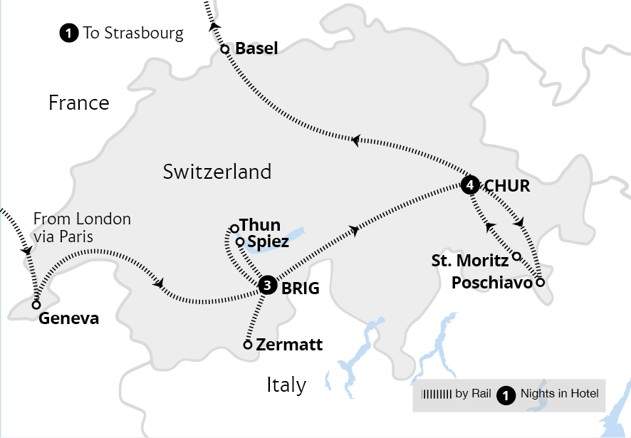 On arrival in Paris, we board the high-speed TGV in First Class and travel east to Switzerland. We join the efficient Swiss rail network in Geneva and begin our climb into the mountains. From our windows, we watch as the landscape increases in beauty and altitude. As we approach our destination, the Swiss Alps surround our route, creating stunning scenes.